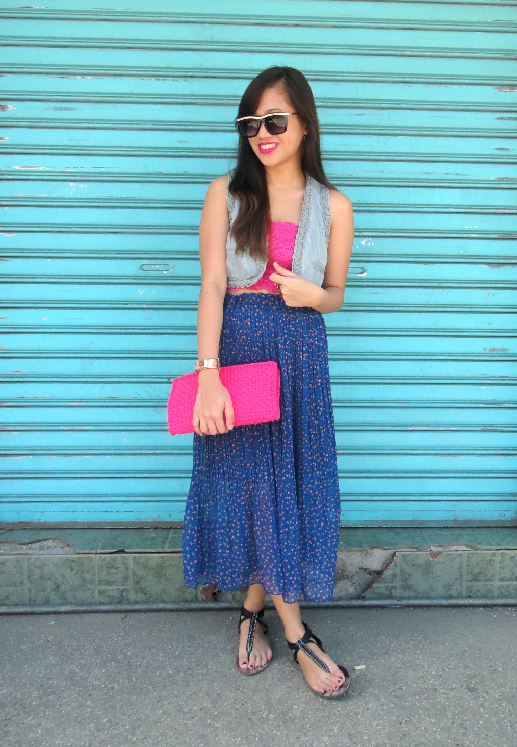 Chiffon maxi skirt plus a tube blouse is really perfect for a hot weather! I supposed to wear a black blazer with it and a pair of heels but my mom said that I was like going to the party or just something formal event. So I changed my heels to a summery sandals and the blazer to a demin vest instead. And it looked really a summer vibe look. I so love it! Let it be summer forever, please? Teehee. Anyway, you could always bring the summer with you by having summer vibe looks!