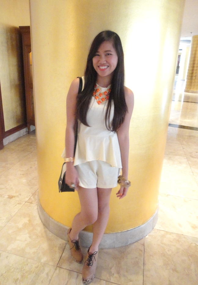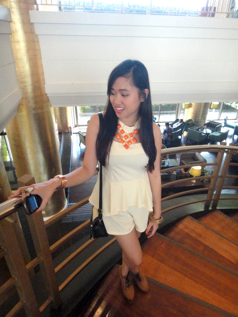 Dress: Peplum Romper from Singapore (a gift from my cousin) | Shoes: Leopard Lace-up Booties from Primadonna | Jewelry: Necklace & Bracelet from bazaar | Watch: Leather & Gold from Dolce and Gabbana | Bag: Sling bag from Genevieve Gozum (a gift from my cousin)
