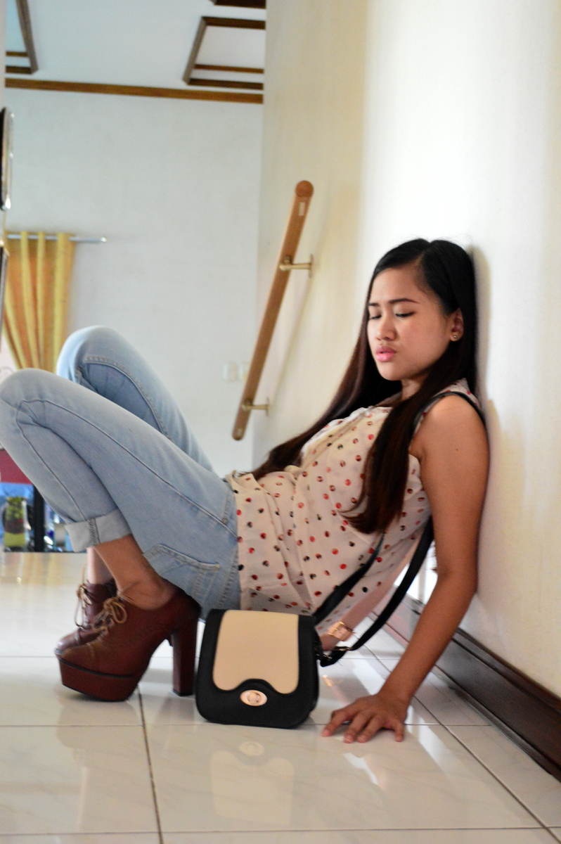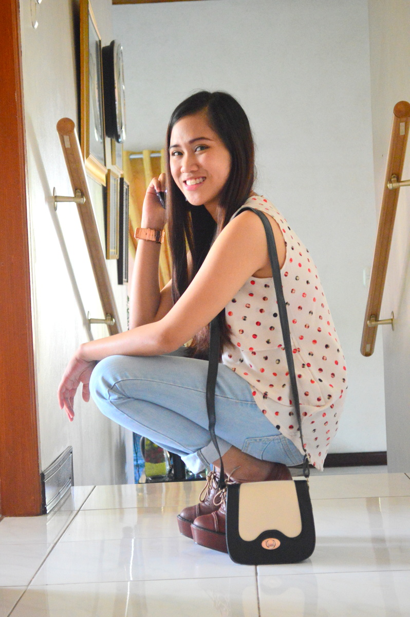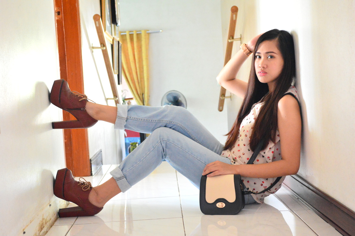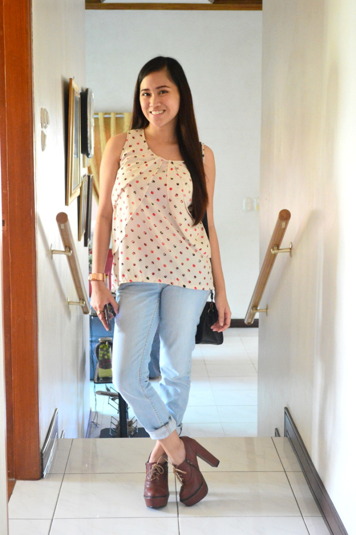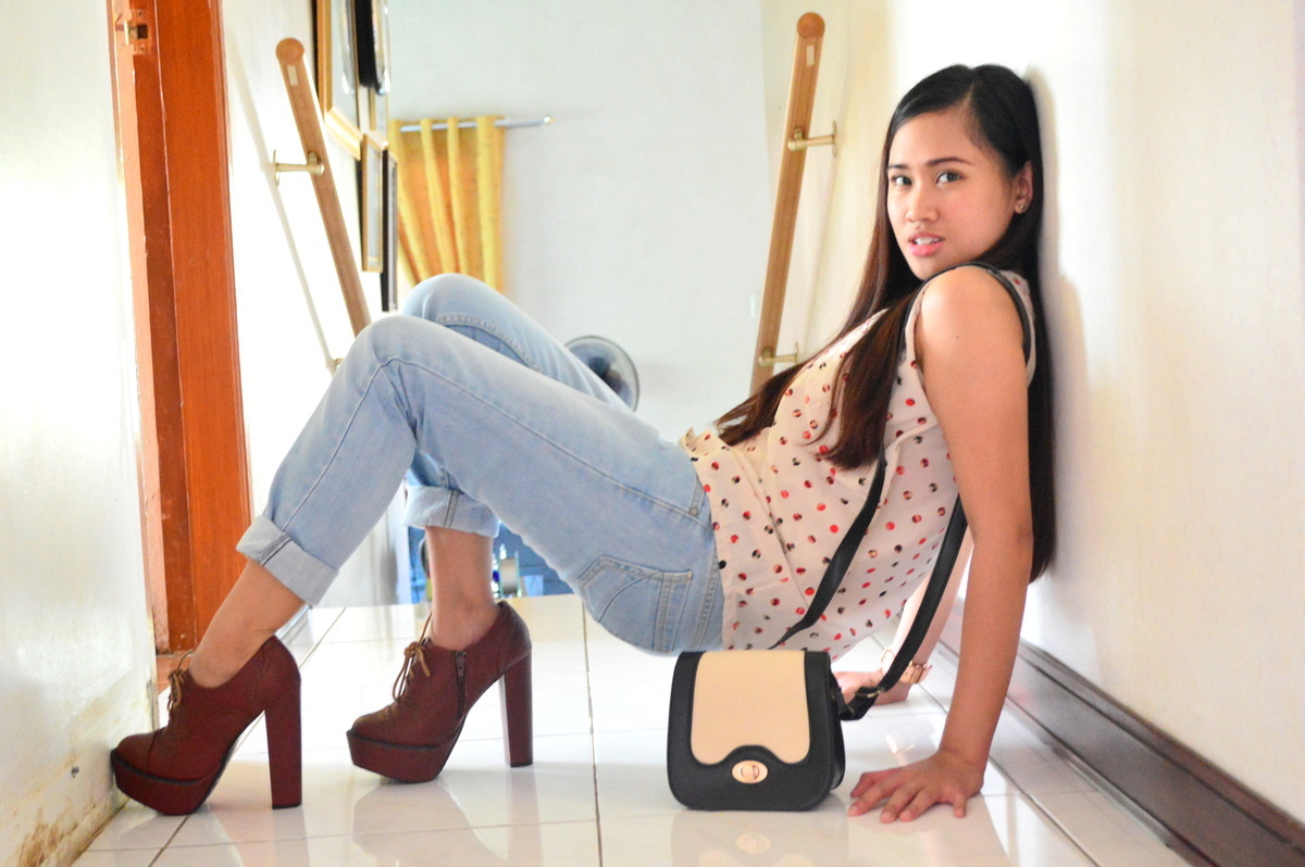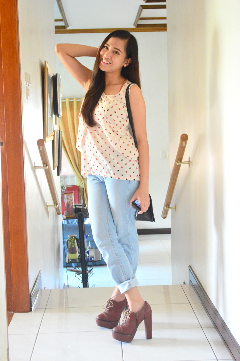 Top: Sleveless Top from bazaar | Bottom: Denim Pants from Penshoppe | Shoes: Oxford Heels from Primadonna | Bag: Sling Bag from Genevieve Gozum