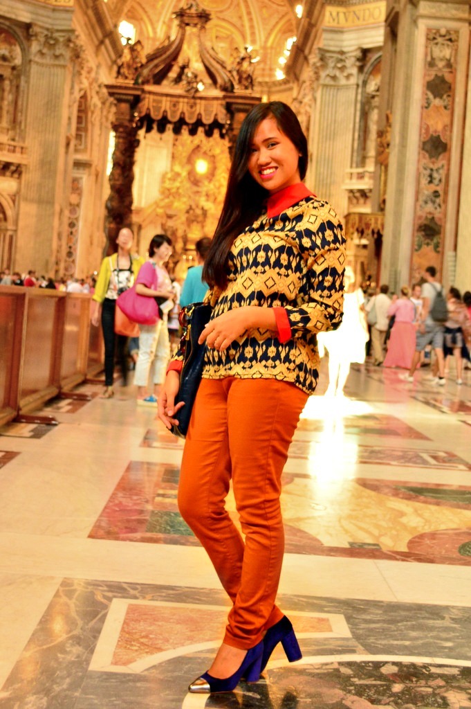 I wore long sleeves and pants to protect my skin from the sun because they said that it’s hotter in Rome *insert scared face here*, and yes it is! I will surely look like a dalmatian soon. Spots everywhere. Haha. Btw, speaking of spot (but a different spot), it’s so hard to find a good spot to do my outfit post. People were roaming around, taking pictures but I have to deal with it! And I just have one question, why do I look taller in photos and smaller in person? Why? :( Lol.