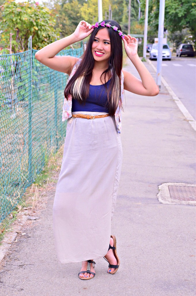 Top from FOREVER21 | Vest from TRUE LOVE | Maxi Skirt and Sandals from bazaar | DIY Flower Crown