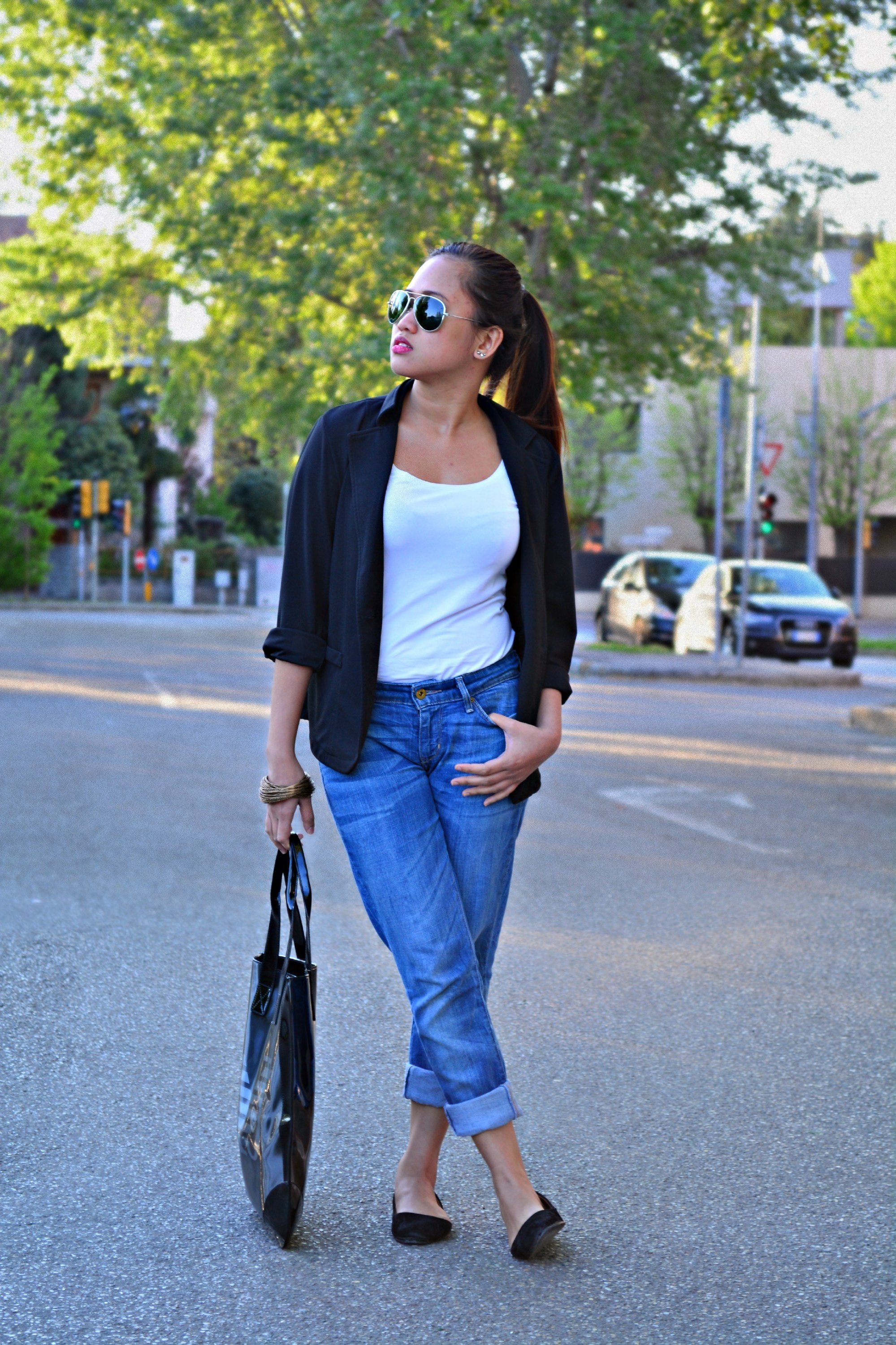 Top: H&M | Bottom: LEVI’S | Outwear: REDHEAD | Shoes: MEROMA | Bag: ARMANI | Sunglasses: RAYBAN